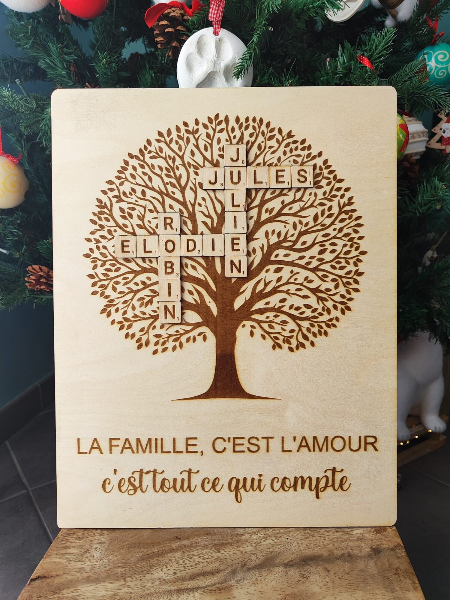 Cadre arbre de famille personnalisé – Lettres Scrabble en bois
